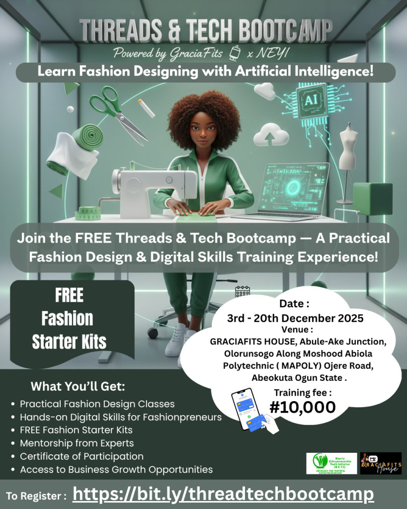 This prestigious bootcamp is proudly organized by the Nigeria Entrepreneurship Youth Initiative (NEYI) in collaboration with Graciafits House, a renowned brand celebrated for its excellence in fashion innovation, creativity, and leadership in the industry. Together, we aim to nurture and empower the next generation of fashionpreneurs.